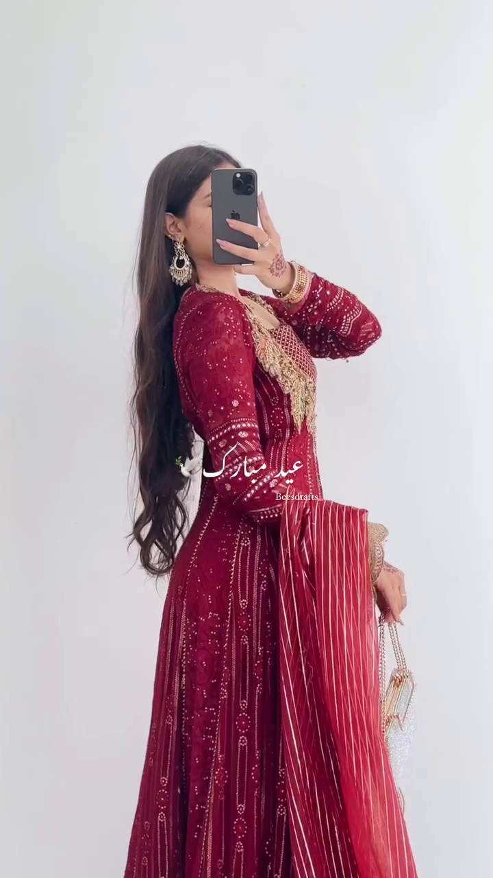 This deep red Anarkali is the ultimate representation of traditional bridal glamour ❤️. Heavily embroidered with golden zari, dabka, sequins, and mirror work, the rich maroon shade symbolizes love, elegance, and festivity. The craftsmanship reflects centuries-old artistry, making it a timeless piece for special occasions.