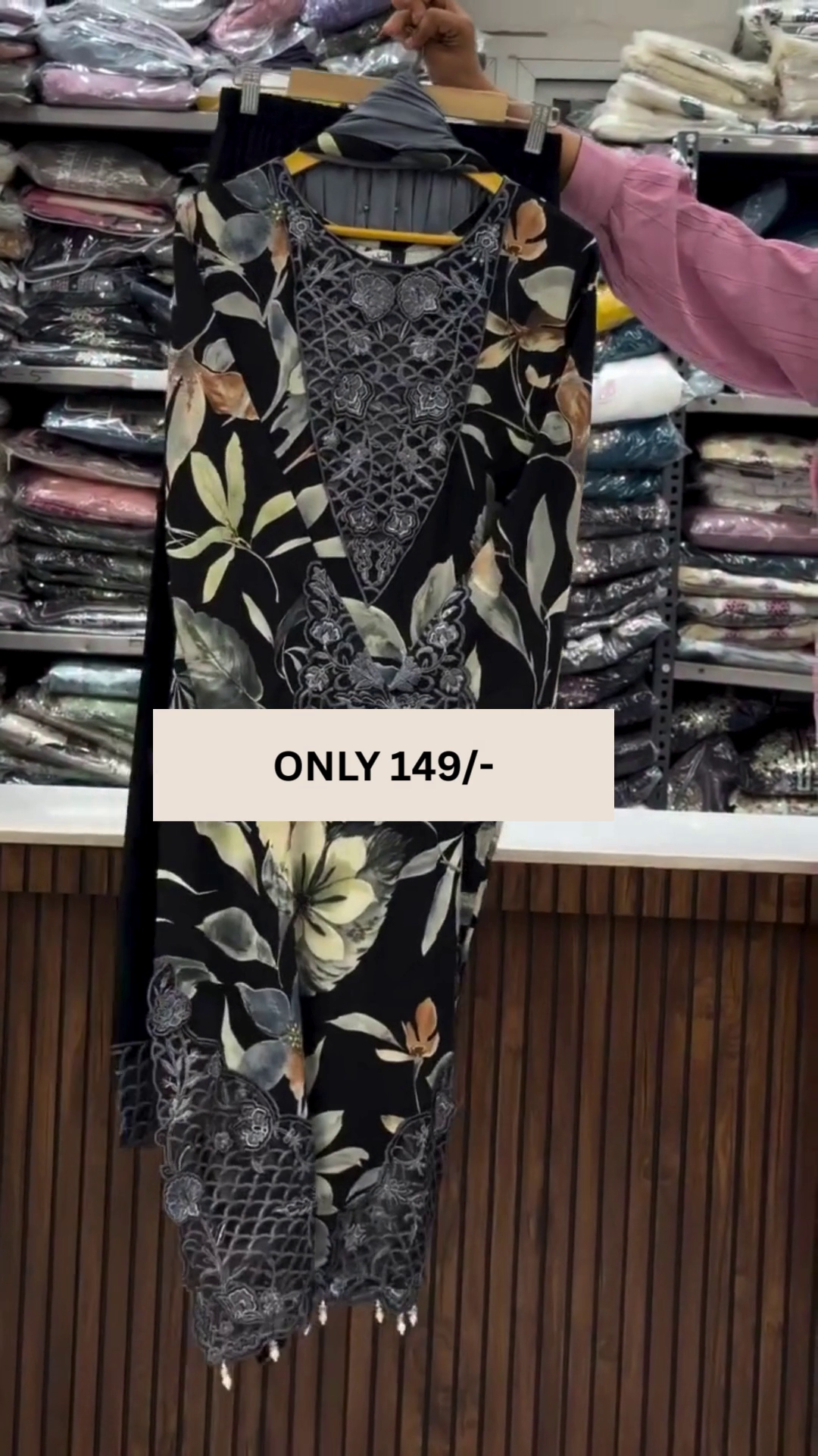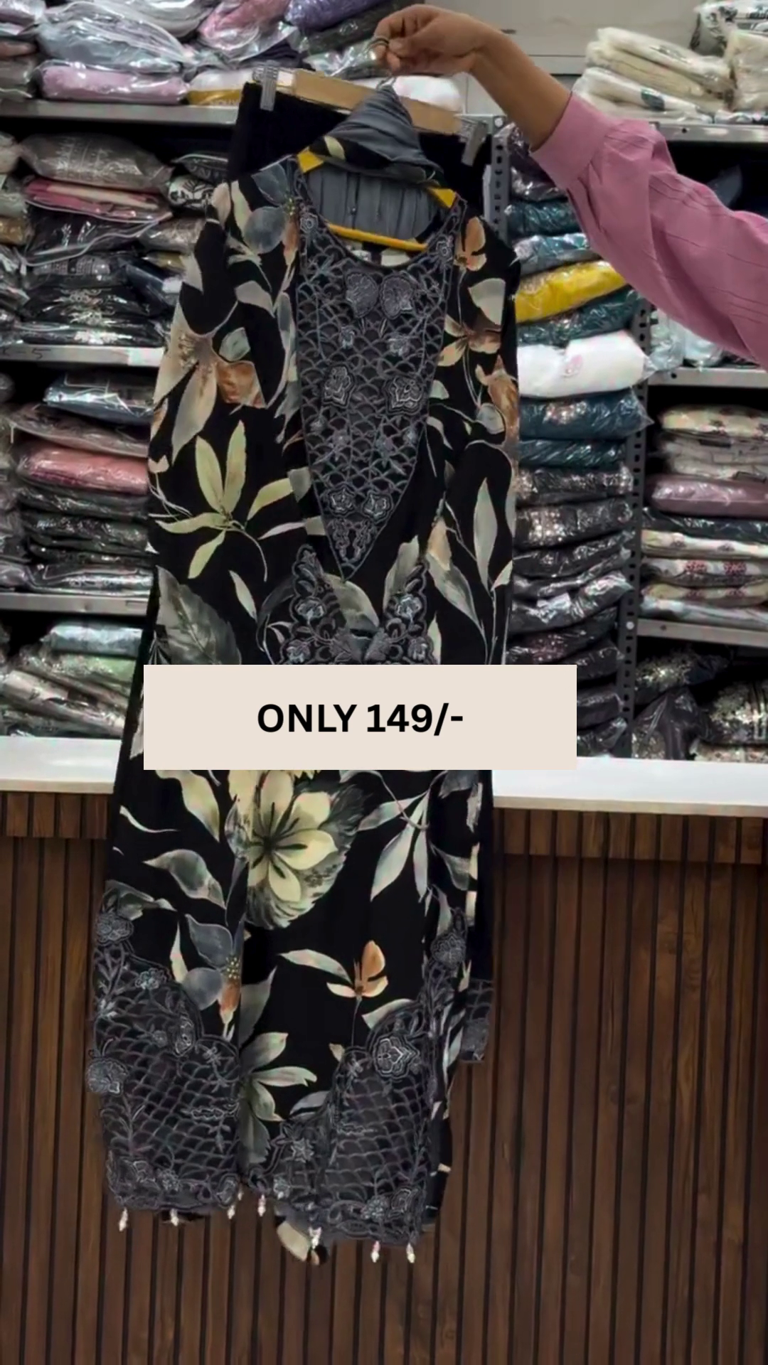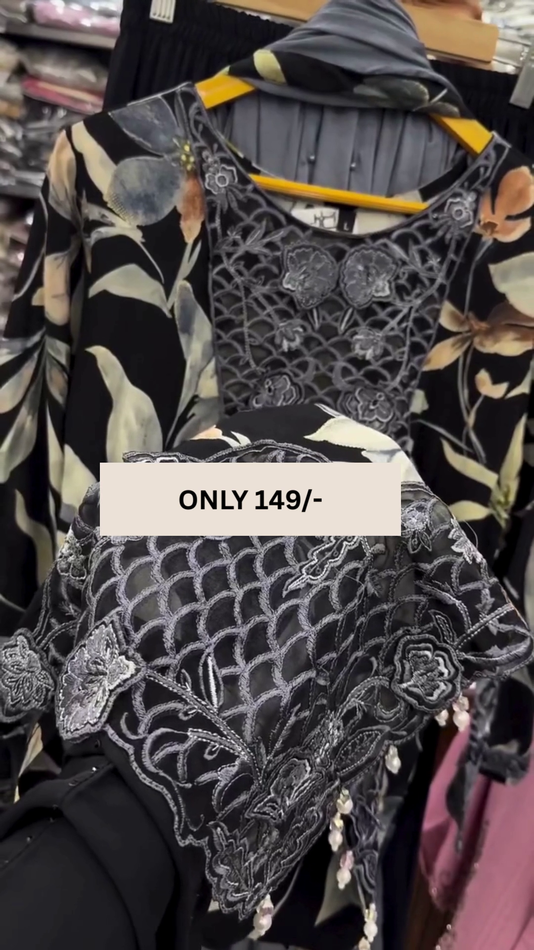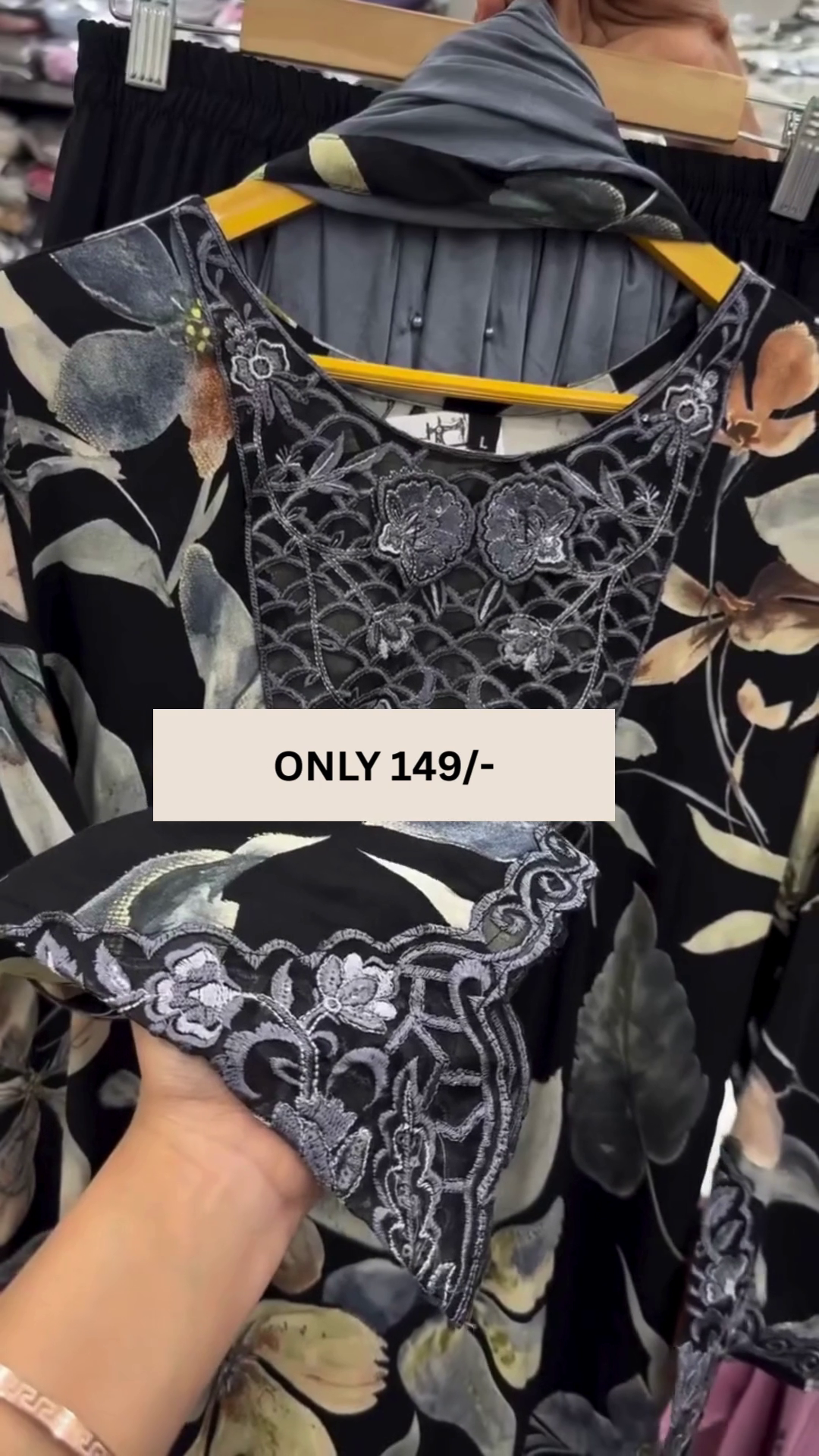 The kurti features a rich black base decorated with soft floral patterns that bring a refreshing and feminine charm to the design. The detailed embroidery on the neckline enhances the overall look, adding a refined and sophisticated touch that elevates the outfit beautifully.