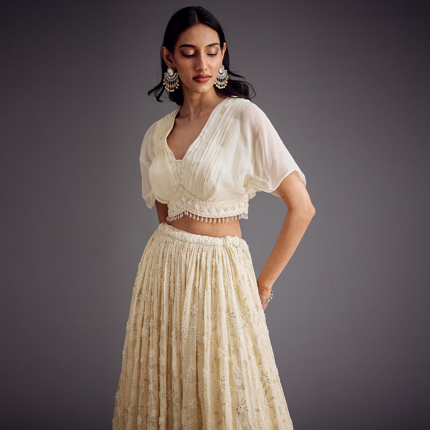 Complementing the skirt is a sheer crop top featuring delicate puff sleeves and a structured bust with intricate pleating. The wrap-style silhouette and beaded hemline detail lend a rich, handcrafted touch. The blend of transparency and structure in the top creates a dreamy, ethereal vibe.