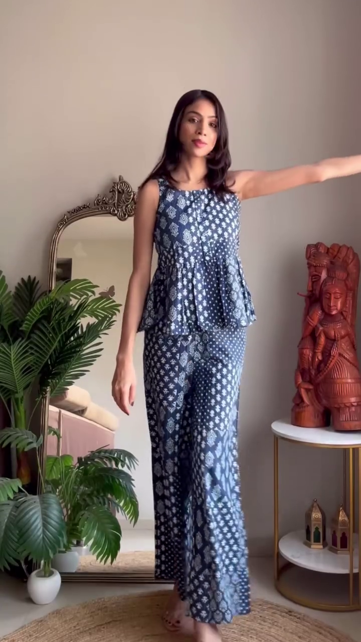 Effortlessly stylish and refreshingly modern, the Indigo Printed Peplum Co-Ord Set is a perfect blend of comfort and statement design. Crafted in a rich indigo hue with intricate white traditional-inspired prints, this ensemble offers a timeless appeal with a contemporary silhouette.