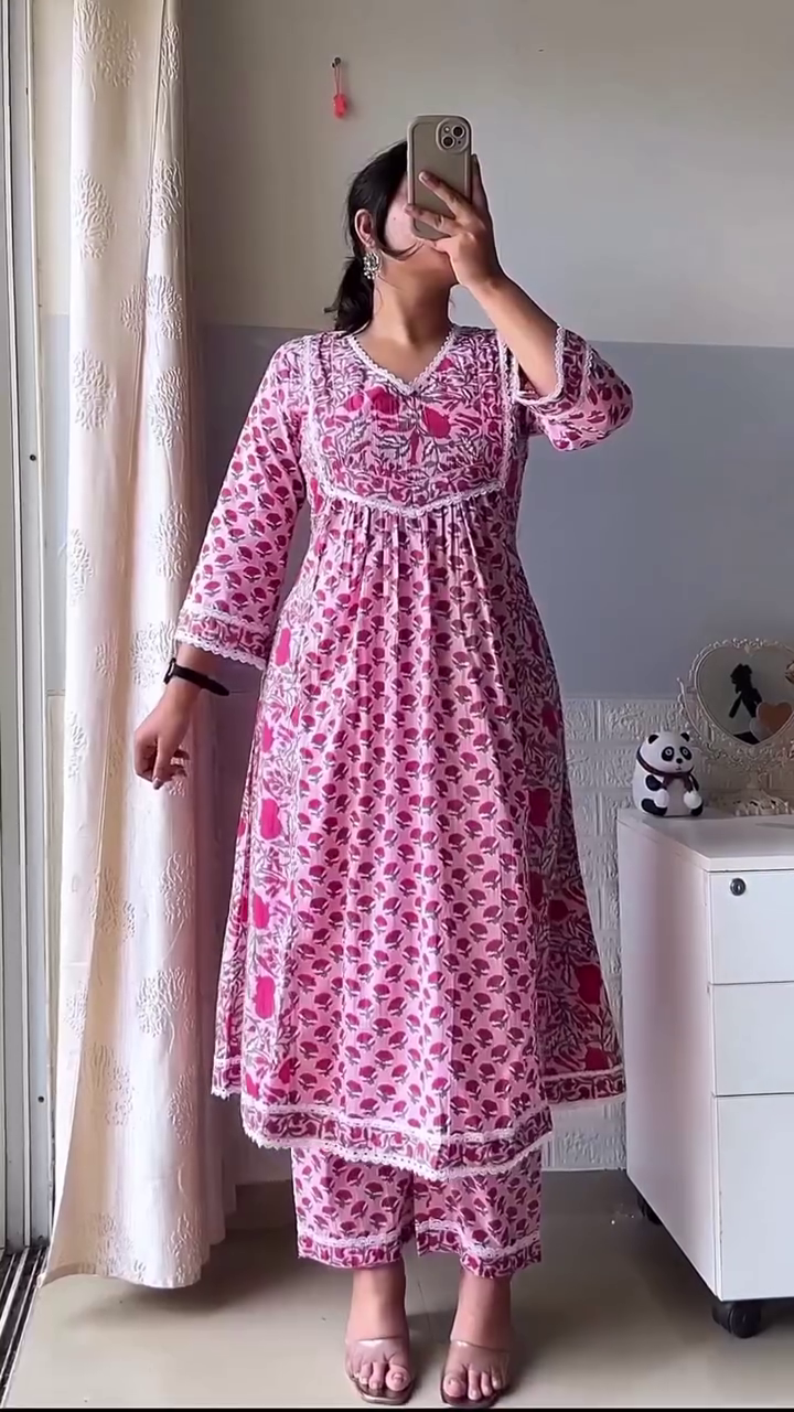 The kurta showcases a flattering straight silhouette with a subtle V-slit neckline accented by gentle detailing along the placket. Three-quarter sleeves lend a balanced, versatile finish, making it perfect for workdays, casual outings, or intimate gatherings. The thoughtfully spaced floral prints create visual harmony, enhancing the overall elegance of the outfit.