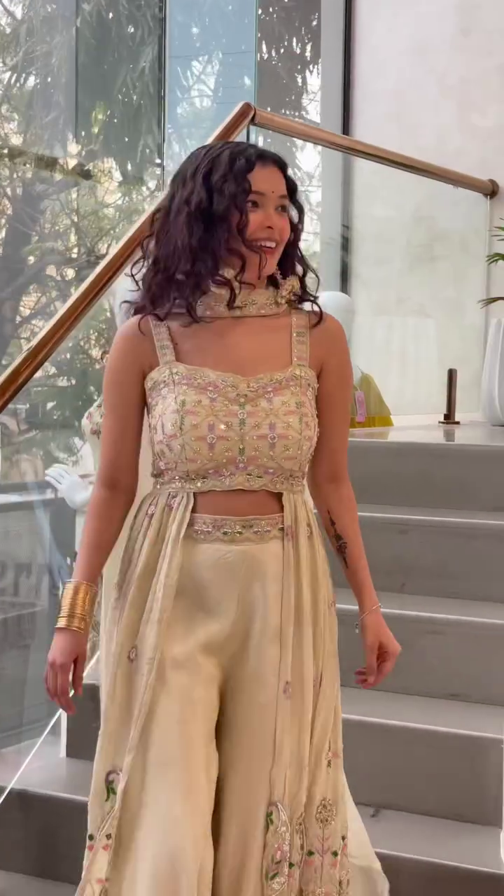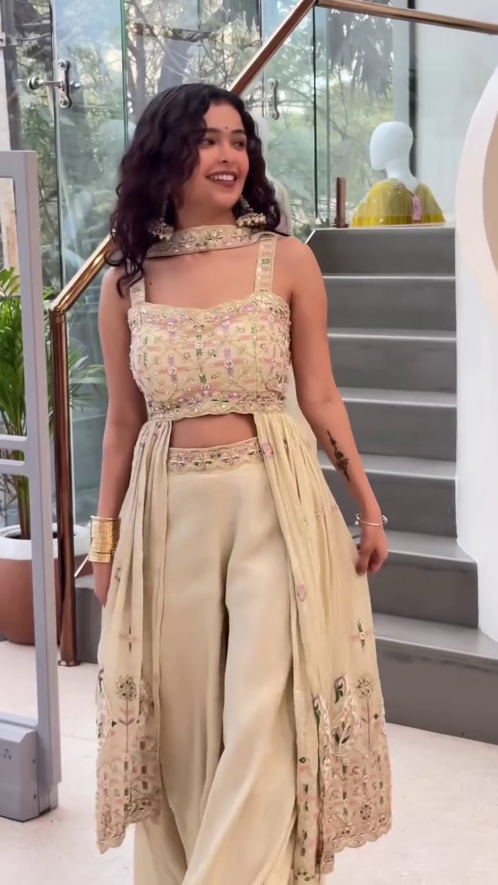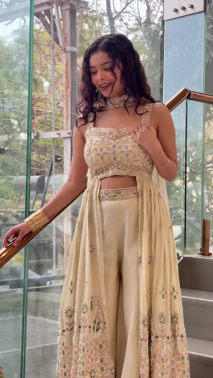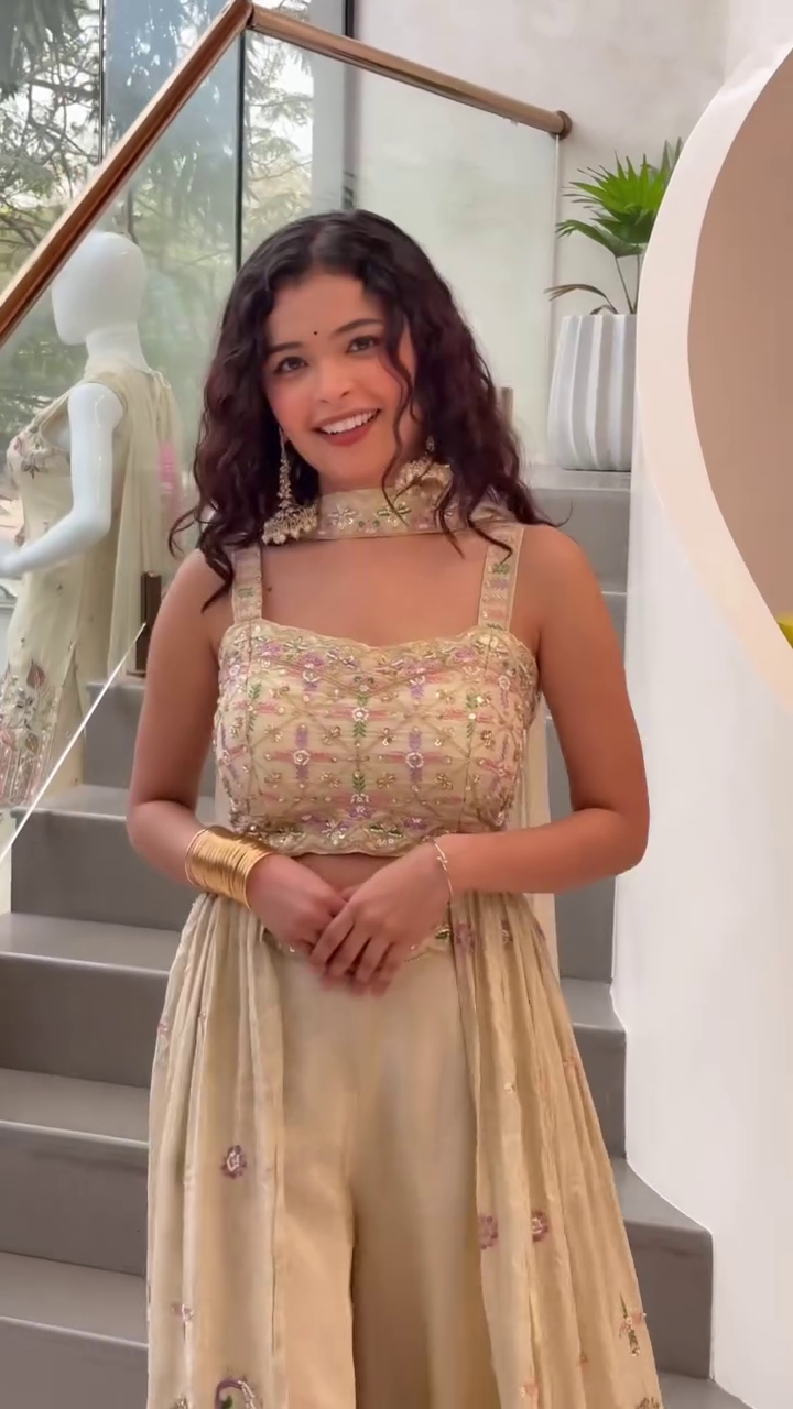 Paired with flowing wide-leg bottoms, the set offers effortless movement and a regal drape. The high-waisted design elongates the frame, while the soft fabric ensures all-day ease. Completing the look is a sheer embroidered overlay that cascades gracefully from the waist, adorned with intricate border detailing for an ethereal touch.