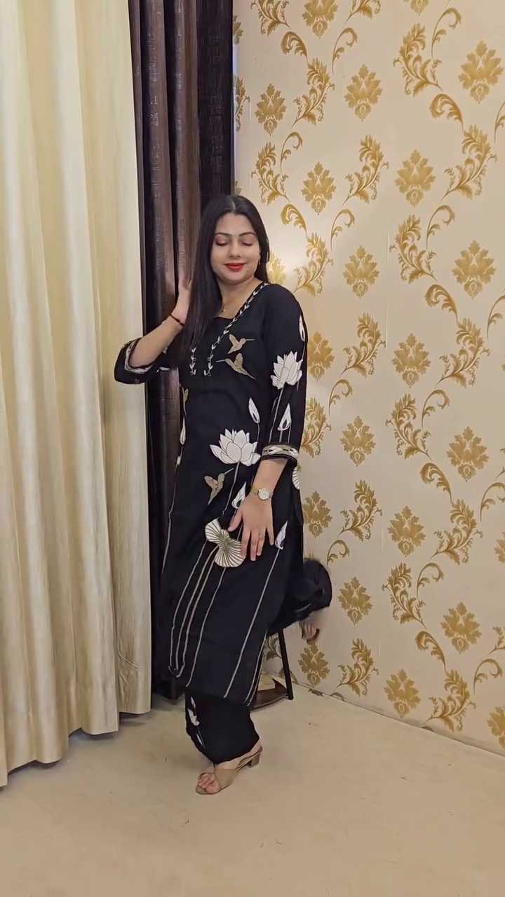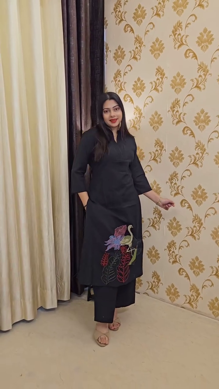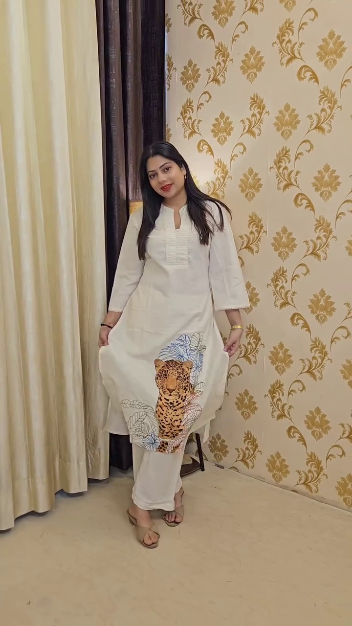 Crafted in a soft ivory hue, the kurta features a clean, straight silhouette with three-quarter sleeves and a refined neckline accented by delicate pintuck detailing. The highlight of the piece is the beautifully illustrated leopard motif placed along the hem, enhanced with soft botanical elements in muted tones. This unique design adds personality without overwhelming the overall elegance of the outfit.