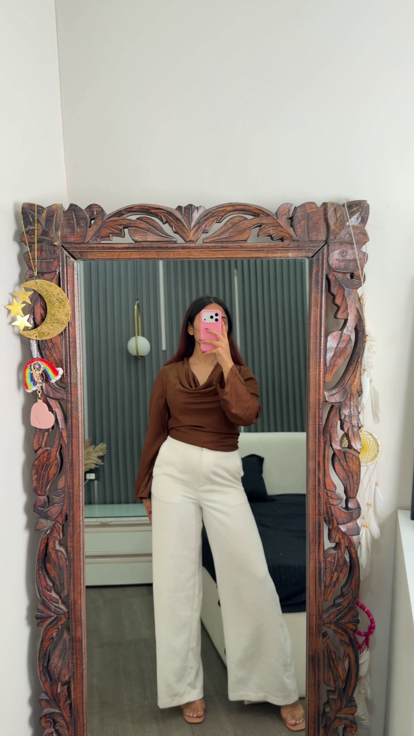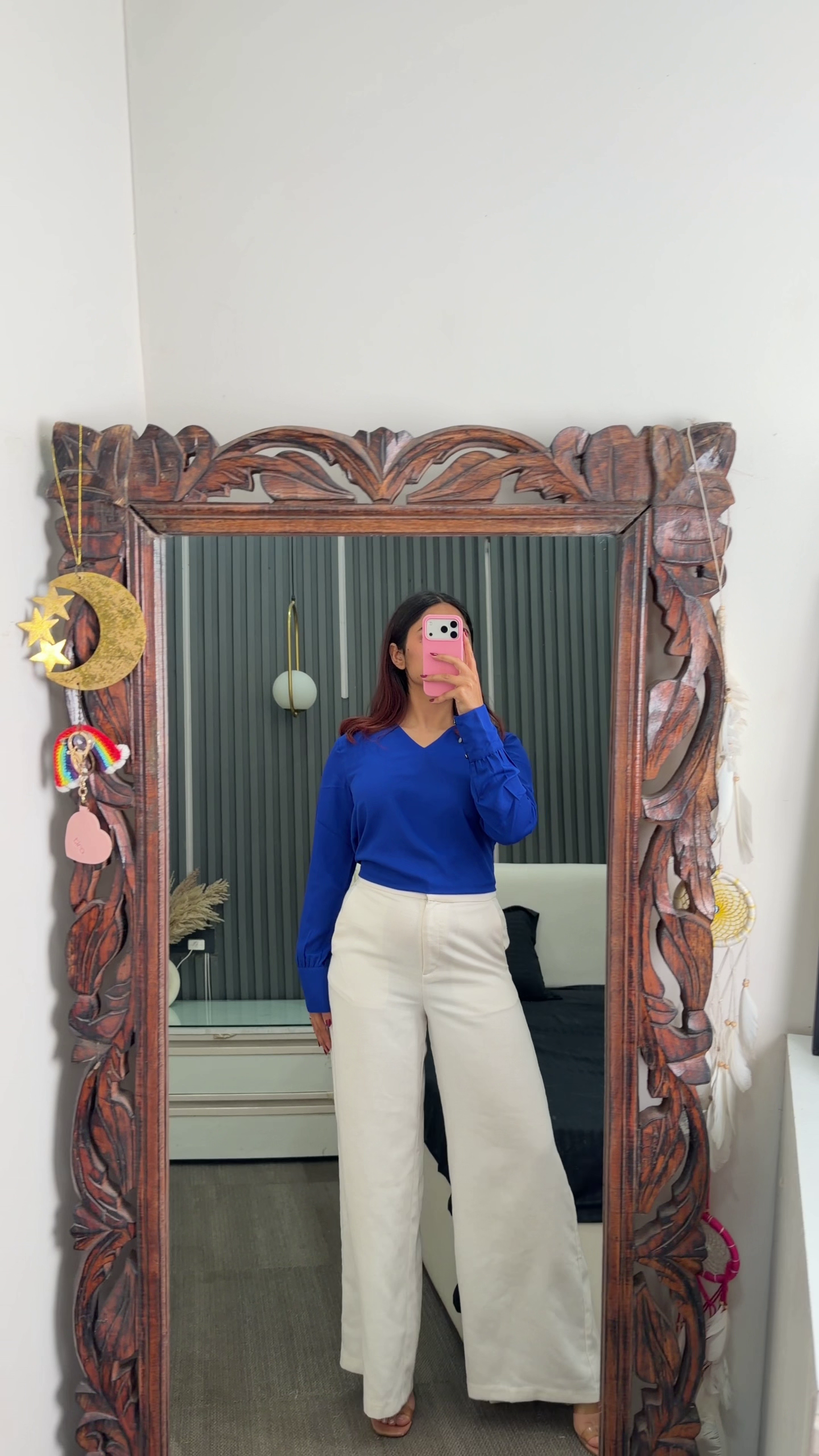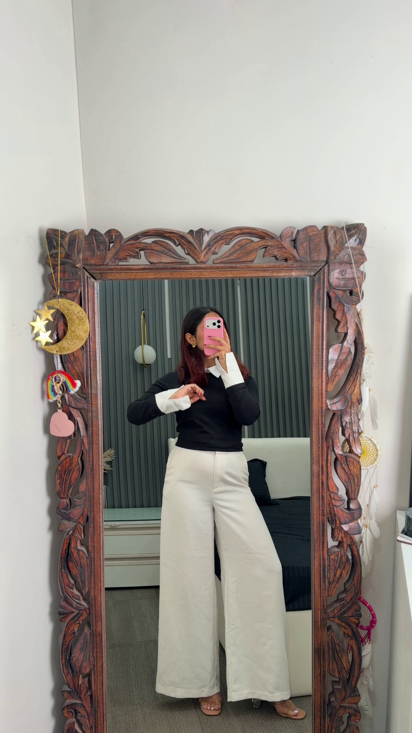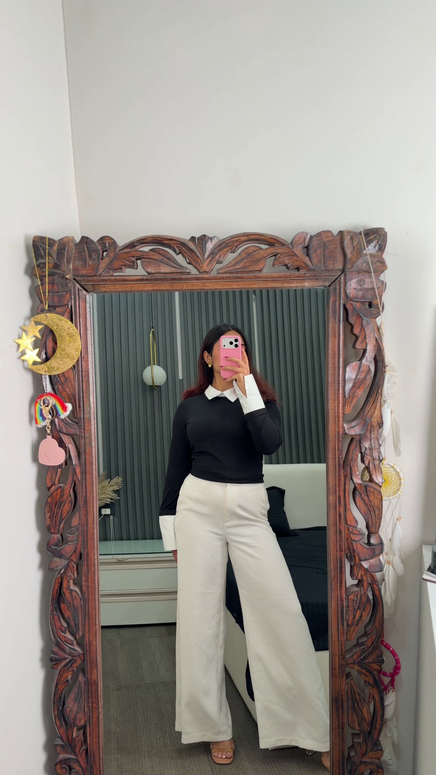 Paired with high-waisted cream wide-leg trousers, the outfit balances structure with comfort. The relaxed silhouette of the trousers provides ease of movement while creating a polished and elongated look. The neutral tone complements the black top perfectly, making this combination ideal for multiple occasions.