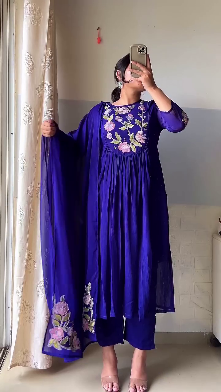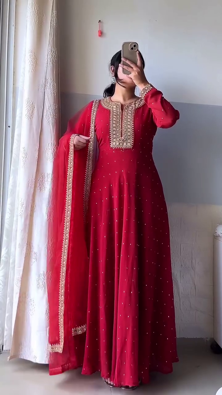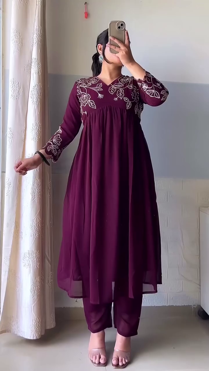 The Anarkali features a flattering V-neckline adorned with intricate ivory floral embroidery across the bodice, creating a striking contrast against the rich base. Delicate threadwork extends along the sleeves and hemline, adding depth and refined detailing. The softly gathered silhouette flows gracefully from the empire waist, offering both comfort and an elegant drape that flatters every movement.