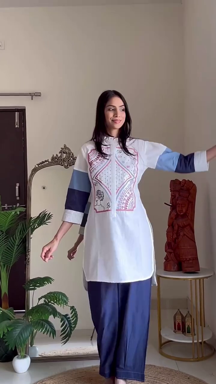 Bring effortless elegance to your everyday ethnic style with this contemporary white kurta paired with navy palazzo pants. Designed with a perfect blend of modern design and traditional charm, this outfit is ideal for casual outings, office wear, brunch gatherings, and relaxed festive occasions.