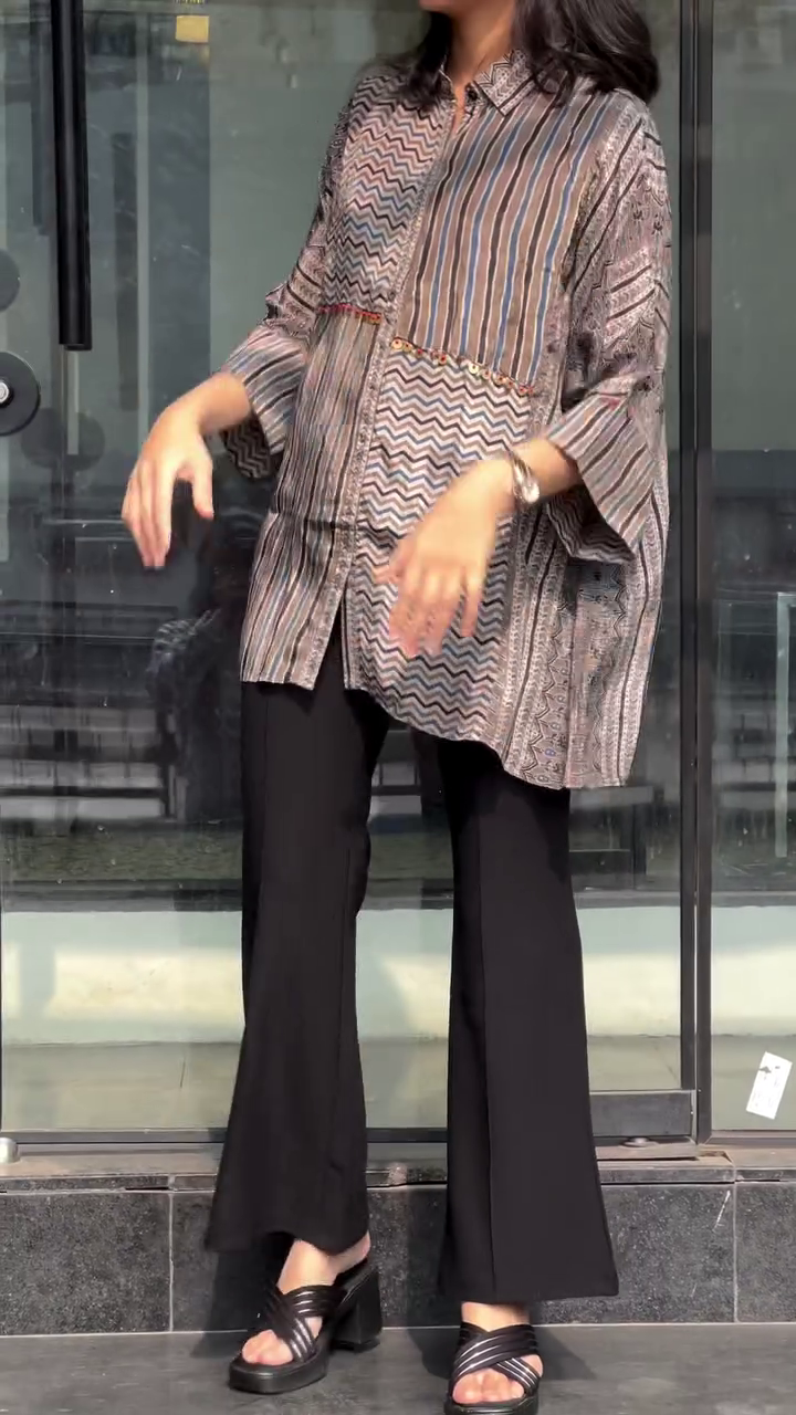 Crafted from lightweight, breathable fabric, it drapes beautifully for a flattering and comfortable fit. The thoughtfully combined patterns create visual interest while maintaining a refined, balanced look. Subtle detailing along the panel seams enhances its structured appeal, giving it a polished yet easygoing vibe.