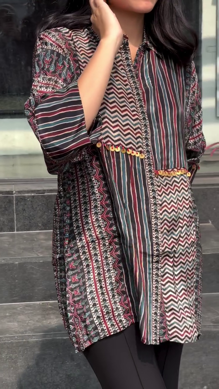 Step into effortless sophistication with the Modern Mosaic Printed Tunic — a perfect blend of contemporary design and relaxed comfort. Featuring a unique mix of vertical stripes and intricate zigzag patterns, this tunic brings artistic detail to a modern silhouette.