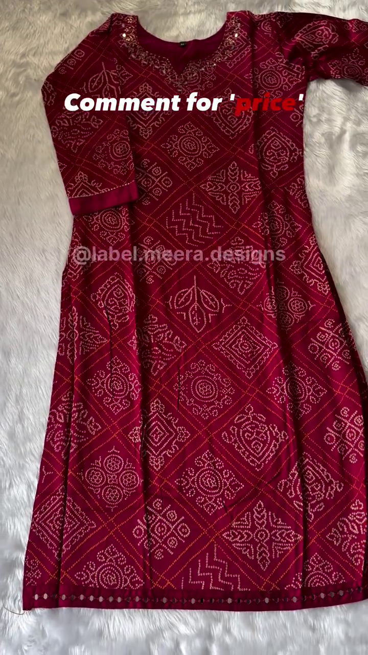 The kurta features intricate Bandhani-style geometric and floral motifs arranged in a diamond grid pattern, creating a timeless ethnic appeal. The neckline is delicately embellished with subtle detailing that adds just the right amount of festive charm without overpowering the look. The straight silhouette offers a comfortable and flattering fit, perfect for both everyday elegance and special gatherings.