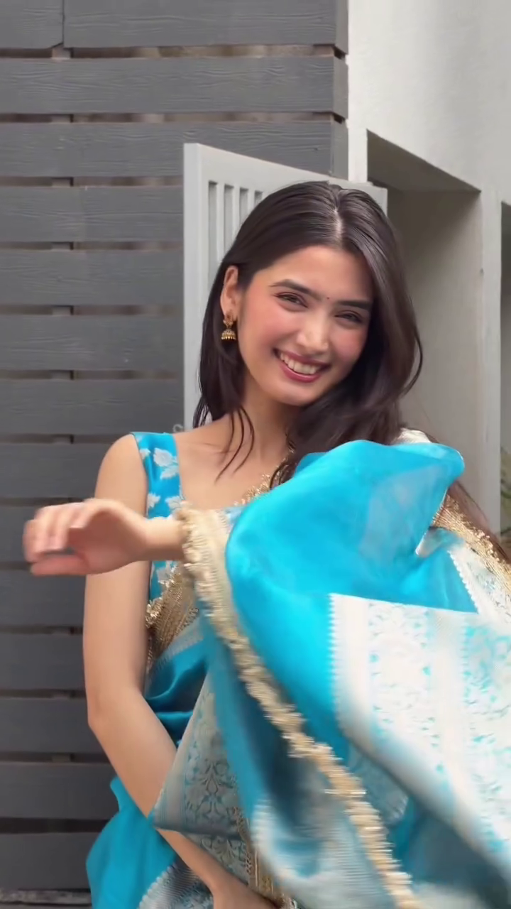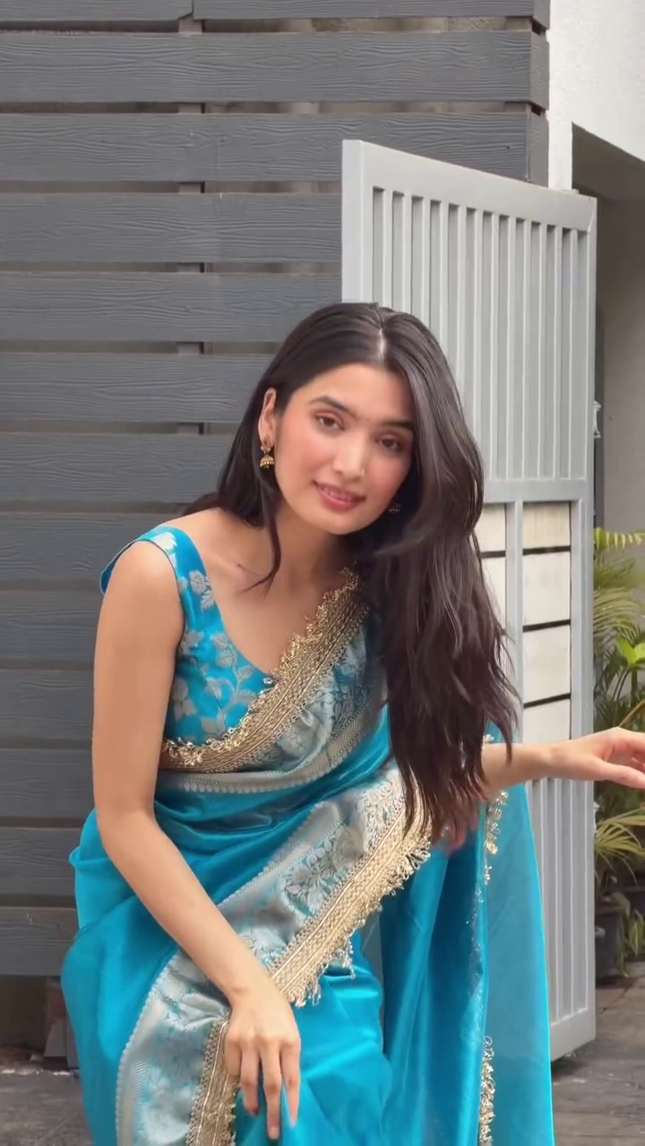 Crafted from a smooth, lightweight fabric, it drapes effortlessly, enhancing the natural silhouette with fluid movement. The highlight of this ensemble lies in its intricately detailed gold border, adorned with delicate embellishments and fine woven patterns that add a regal finish. The subtle sheen of the fabric paired with the ornate trim creates a perfect balance between tradition and contemporary charm.